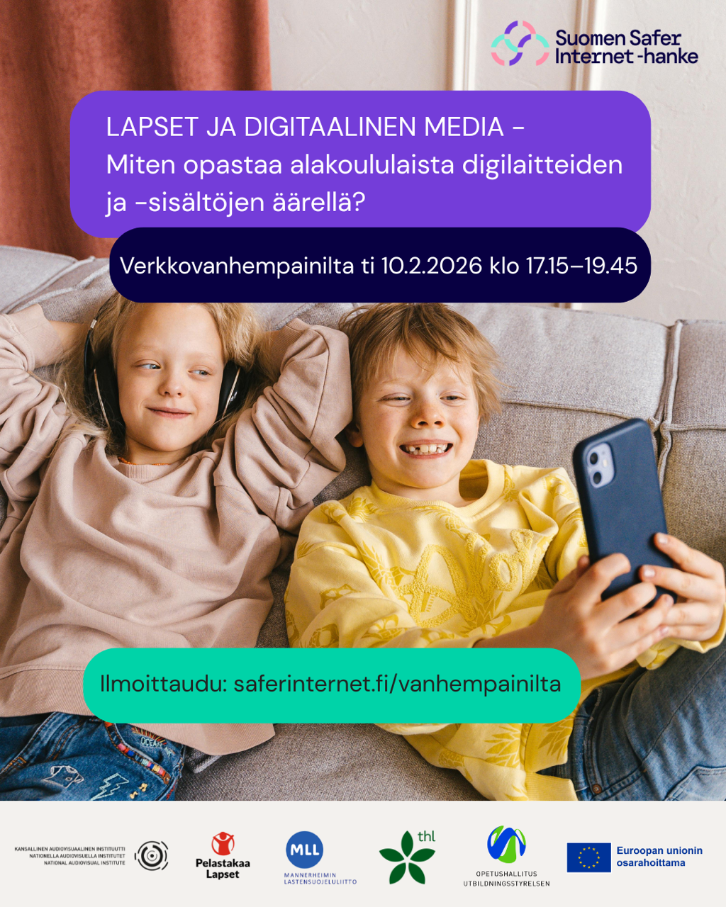 Tervetuloa Lapset ja digitaalinen media -verkkovanhempainiltaan tiistaina 10.2.2026 klo 17.15–19.45! Ilta on suunnattu alakouluikäisten vanhemmille ja huoltajille ja on avoin kaikille aiheesta kiinnostuneille.