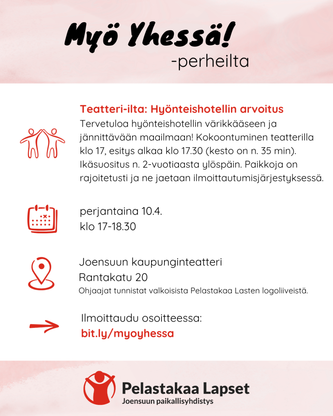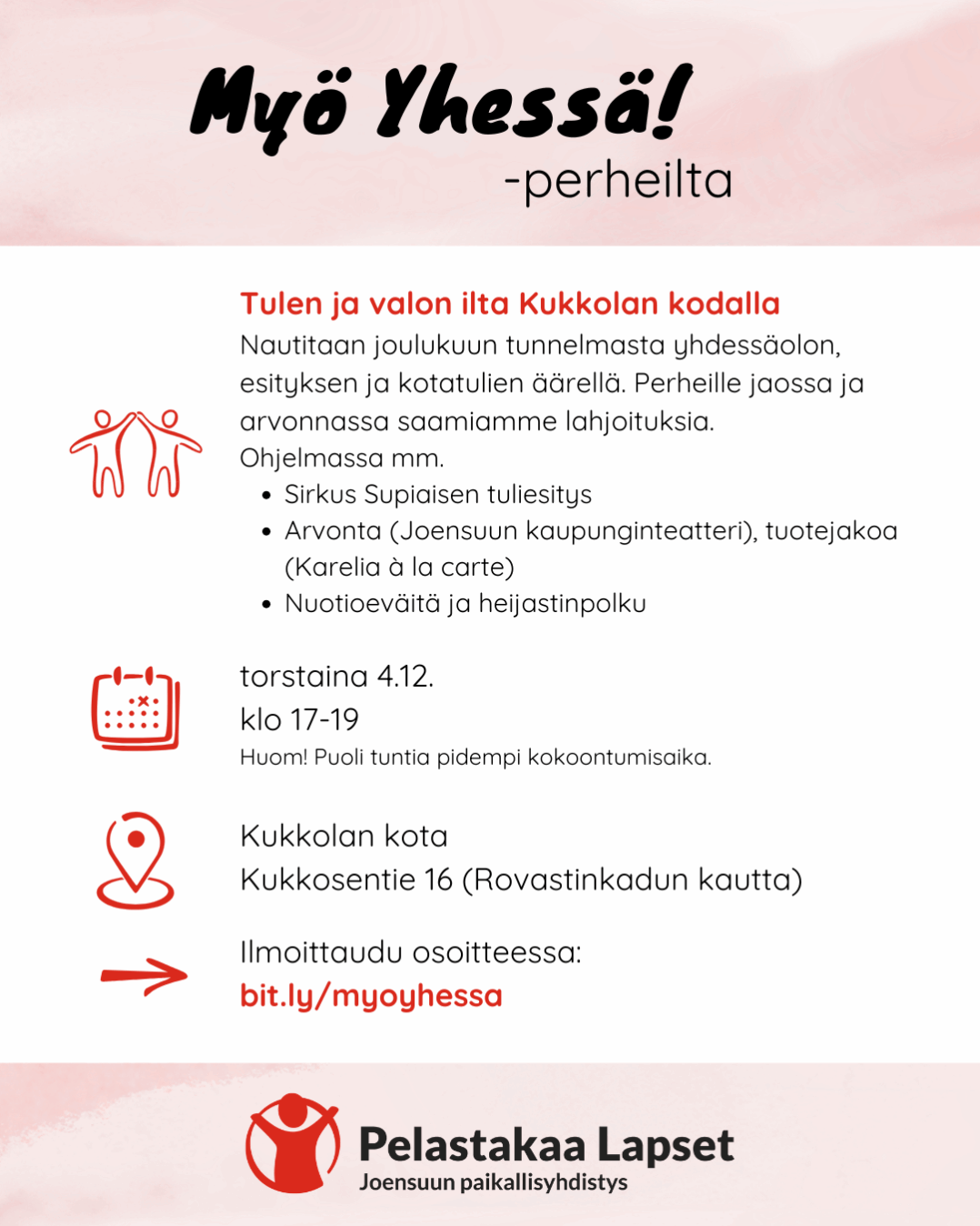 Myö Yhessä! -perhetoiminta on joka toinen torstai-ilta tapahtuvaa koko perheen vapaa-ajan toimintaa. Yhdessä tehden perheen sisäinen vuorovaikutus, voimavarat ja jaksamisen vahvistuvat. Myönteiset kokemukset, onnistumiset, mukavat muistot ja muihin perheisiin tutustuminen tuovat hyvää mieltä arkeen! Perheilloissa apukäsinä toimivat toimintaan perehdytetyt vapaaehtoiset ohjaajat sekä työntekijä. Perheillat ovat maksuttomia ja päihteettömiä. Tervetuloa mukaan!