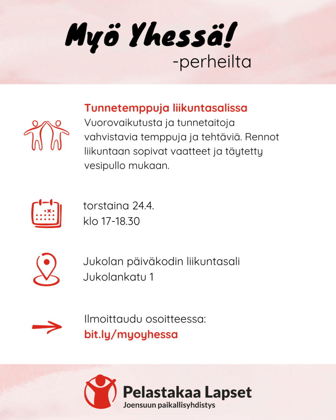 Myö Yhessä! -perhetoiminta on joka toinen torstai-ilta tapahtuvaa koko perheen vapaa-ajan toimintaa. Yhdessä tehden perheen sisäinen vuorovaikutus, voimavarat ja jaksamisen vahvistuvat. Myönteiset kokemukset, onnistumiset, mukavat muistot ja muihin perheisiin tutustuminen tuovat hyvää mieltä arkeen! Perheilloissa apukäsinä toimivat toimintaan perehdytetyt vapaaehtoiset ohjaajat sekä työntekijä. Perheillat ovat maksuttomia ja päihteettömiä. Tervetuloa mukaan!