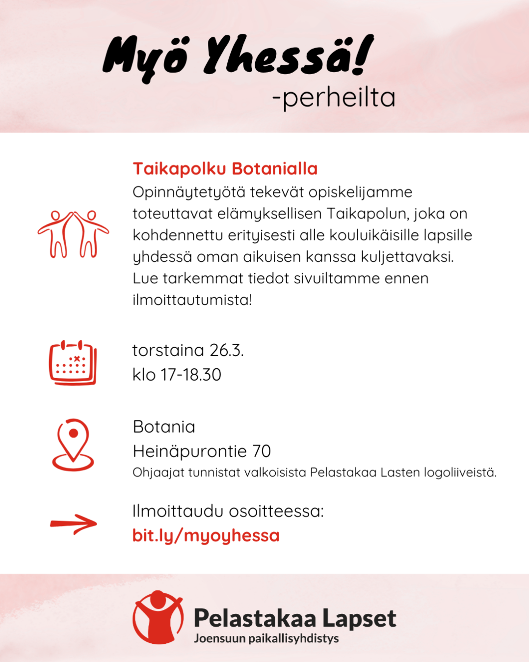 Paikkoja on rajoitetusti ja ne täytetään ilmoittautumisjärjestyksessä.