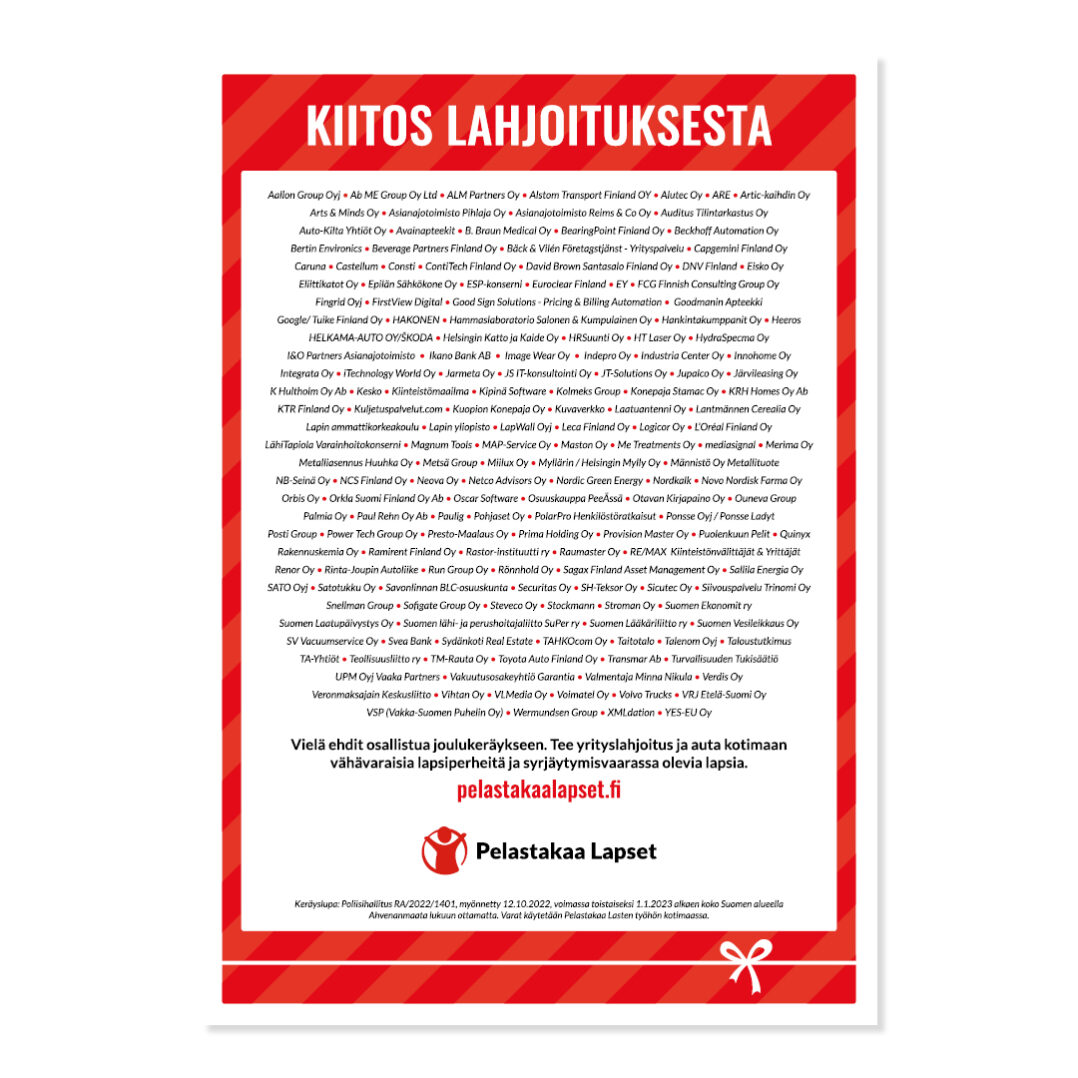 Keräyslupa: Poliisihallitus RA/2022/1401, myönnetty 12.10.2022, voimassa toistaiseksi 1.1.2023 alkaen koko Suomen alueella Ahvenanmaata lukuun ottamatta. Varat käytetään Pelastakaa Lasten työhön kotimaassa.