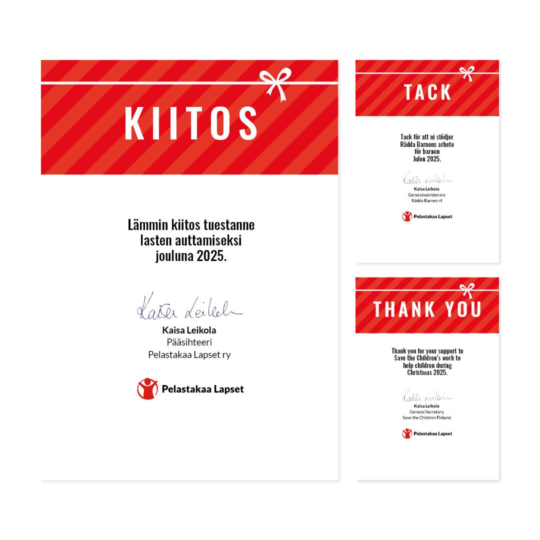 Mikäli lahjoitus on tehty pankkitilisiirtona ja sen arvo on 400 euroa tai suurempi, ole keräystunnuksiin liittyen yhteydessä: lahjaksitulevaisuus@pelastakaalapset.fi.