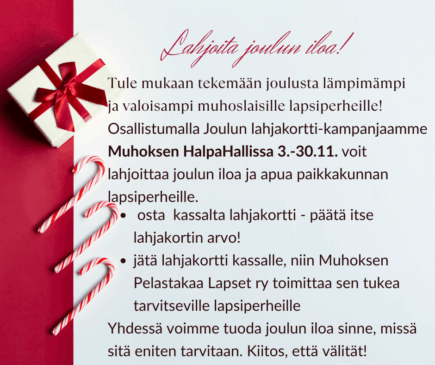 Tule mukaan tekemään joulusta lämpimämpi muhoslaisille lapsiperheille! Osallistumalla Joulun lahjakorttikampanjaamme Muhoksen Halpahallissa 3.-30.11. voit lahjoittaa apua paikkakunnan lapsiperheille.